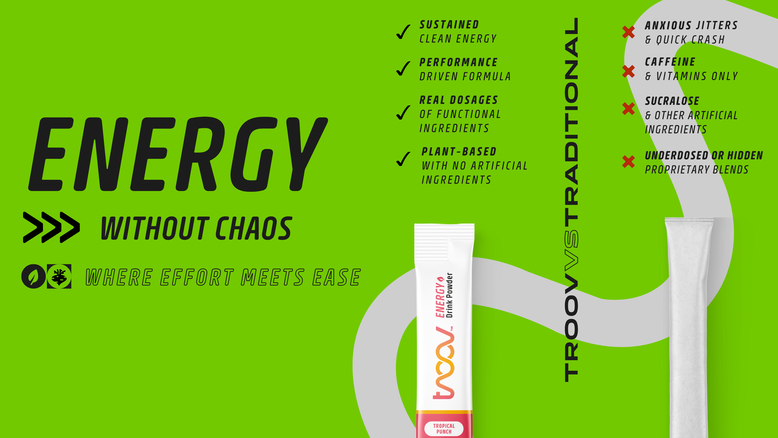 Troov is a clean energy + hydration mix designed to help you stay energized, focused, and in flow, without the crash, jitters, or synthetic junk.