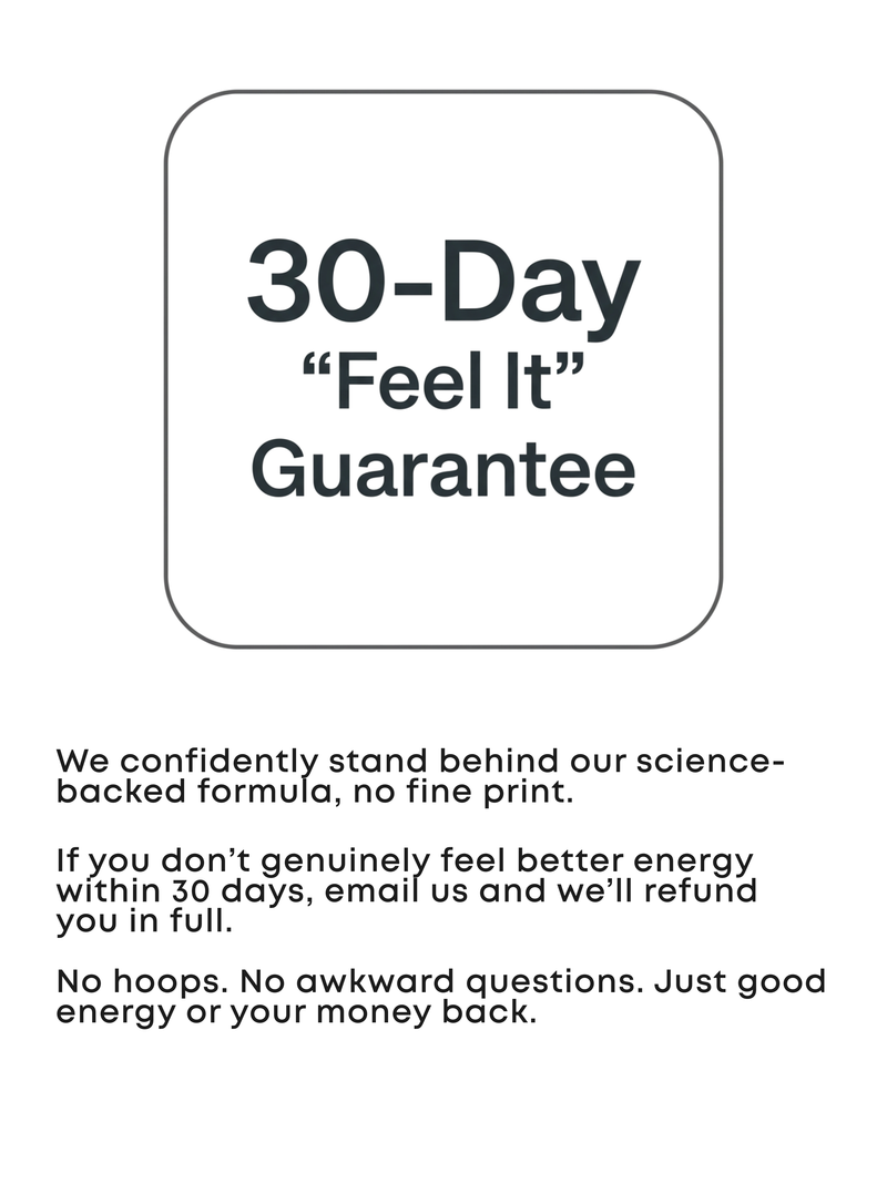 30-day money-back guarantee. If Troov doesn’t deliver clean, smooth energy within 30 days, we’ll issue a refund for your order. No questions asked.