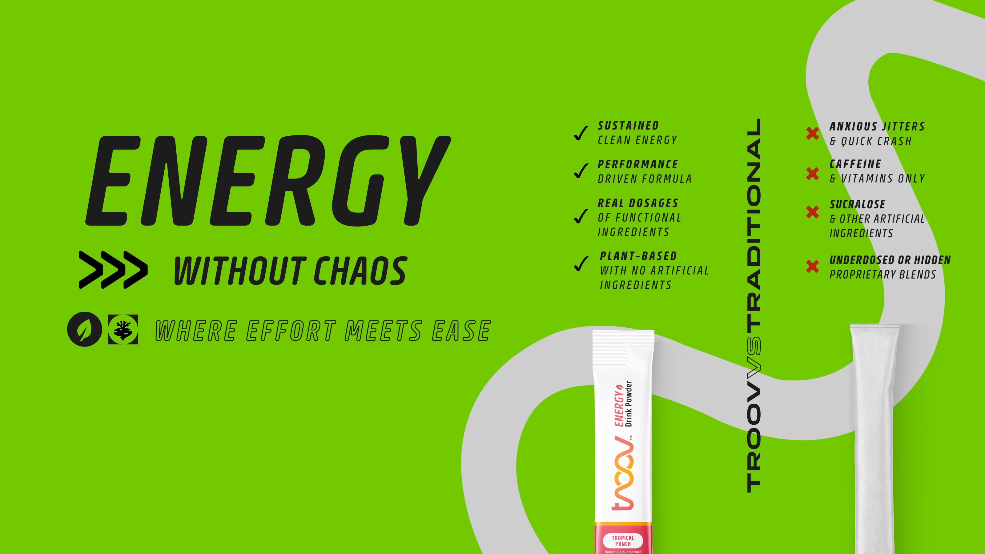 Coffee hits fast and fades hard. Troov provides sustained energy, better focus, and hydration without upsetting your stomach or sleep.